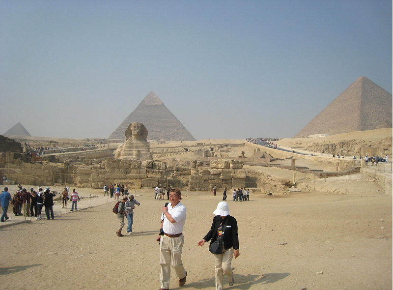 三大ピラミッドとスフィンクス クフ王のピラミッド(高さ:現在138.8m、かつては146.8mだった) カフラー王のピラミッド(中央、高さ:136m:守護するスフィンクス) メンカウラー王のピラミッド(一番小さい、高さ:65m) |