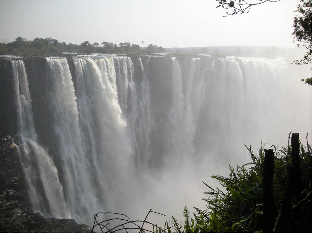 ビクトリアフォールズ ビクトリアフォールズ(世界三大瀑布の一つ) 幅、1700m、最大落差108m ザンビヤ共和国とジンバブエ共和国の国境線に位置し、イギリスの宣教師であり探検家、デビット リビングストンにより発見された。時のイギリス女王ビクトリアに捧げるという事で、名前がつけられた。(場所によっては、しぶきが雨のように!) |